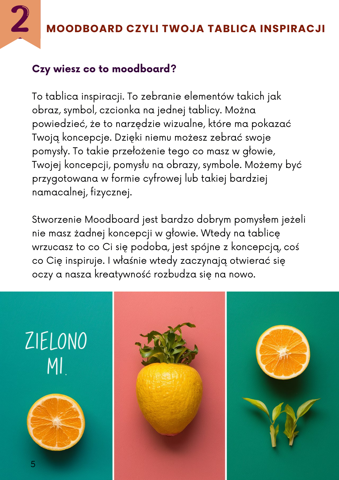 Nie wiesz co to moodboard? W rozdziale drugim dokładnie opiszę czym jest moodboard. Czy zawsze należy go tworzyć? Co takiego nam daje przygotowanie moodboardu? Zobaczysz krok po kroku go stworzyć. Oprócz tego na stronach znajdziesz kilka niezwykle inspirujących przykładów.