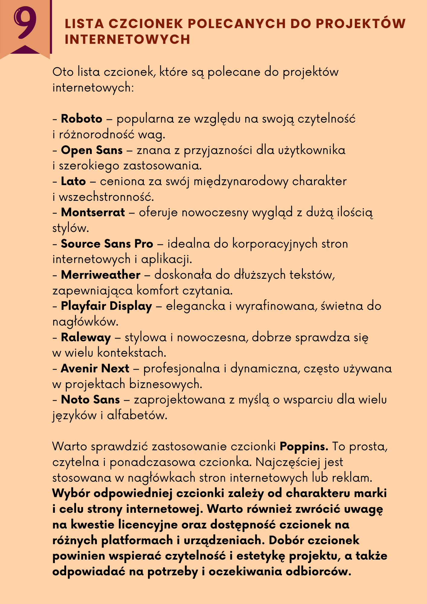 Rozdział dziewiąty to kompendium użytecznej wiedzy o fontach. Dowiesz się jakie mamy rodzaje fontów, które warto stosować a których lepiej unikać. Podam Ci również gotową listę fontów do różnych zastosowań.